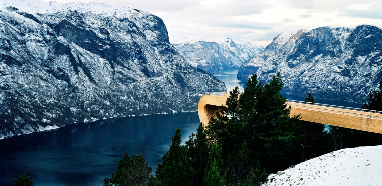 Aurland观景台以挪威松恩峡湾森林原木包裹,从600多米的峡谷上成直角垂直落下,观景台的尽头直冲云霄,就像一条永无止境的路,通向云山雾罩的邻里丛山之中,让人望而却步。然而实际上在弧度处是有一面玻璃墙阻隔的,想要步行到尽端,透过玻璃墙眺望幽远的深谷的游客,一定得有足够的胆量才行。